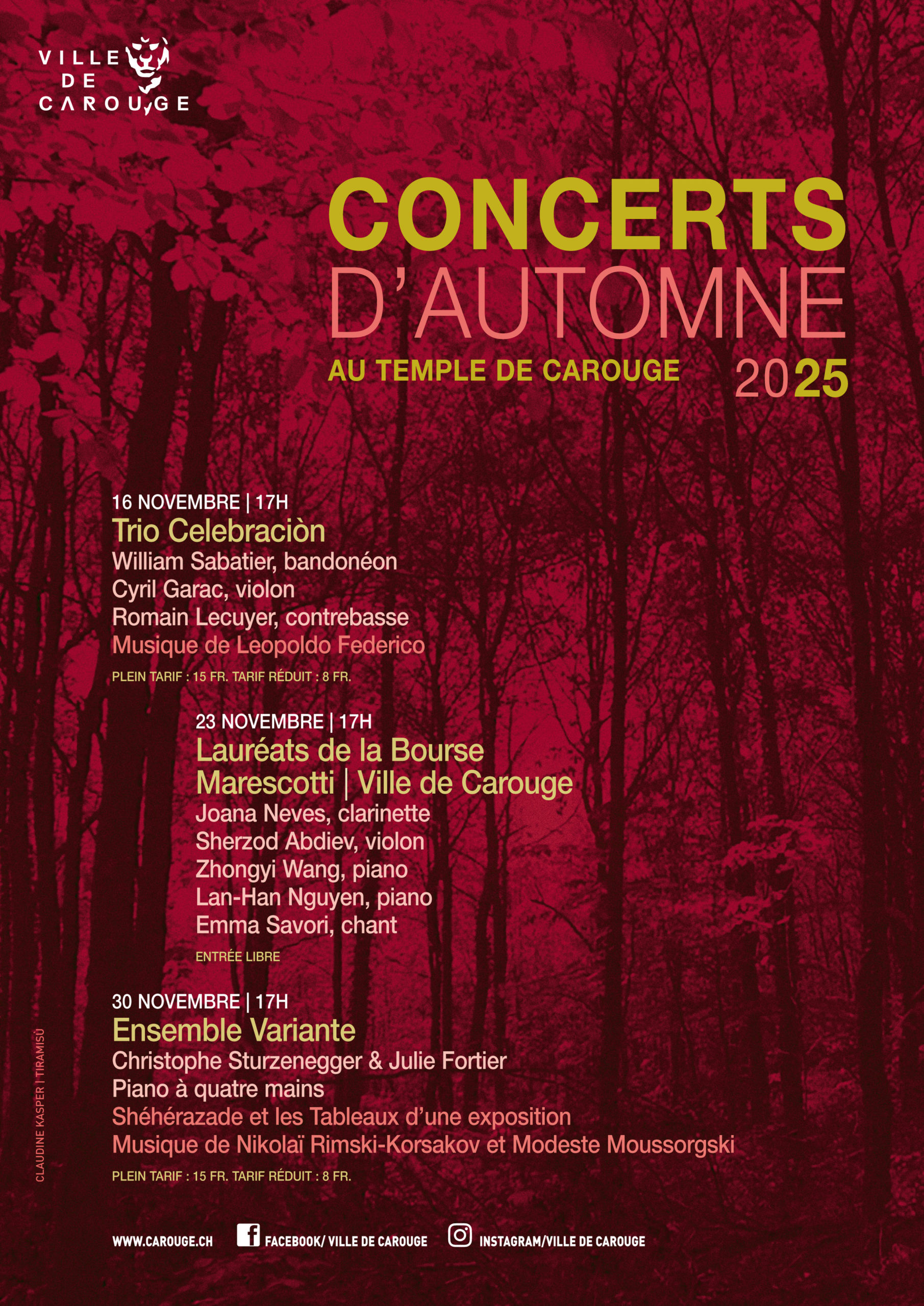 Cette année le Concert des lauréats offert au public et aux mélomanes carougeois aura lieu le dimanche 23 novembre 2025 à 17h dans le cadre des traditionnels Concerts d’automne au Temple de Carouge organisés par le Service des Affaires culturelles et de la Communication de la Ville de Carouge. À cette occasion, les diplômes de la Bourse 2025 seront remis aux lauréat(e)s.